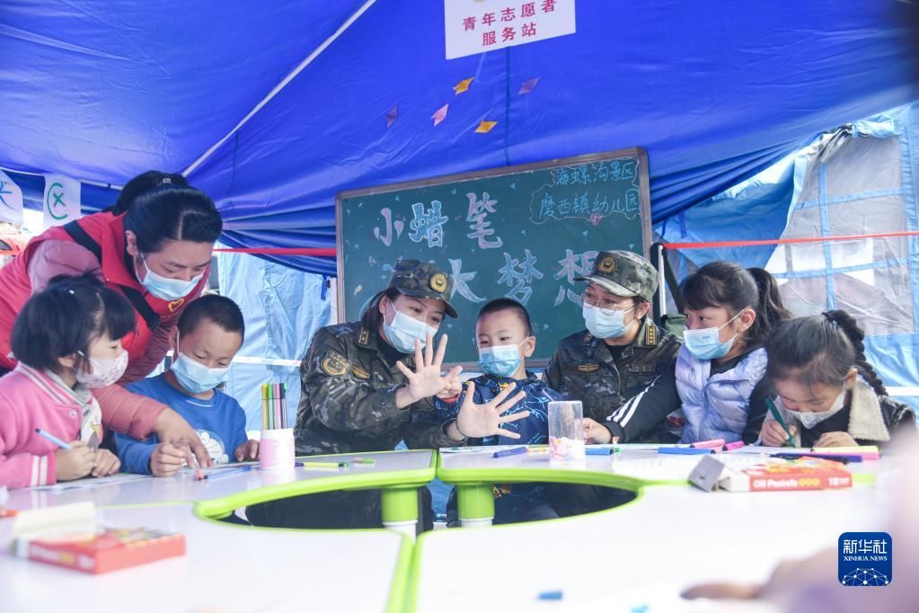 9月8日,武警四川总队保障部派出心理专家队在泸定县磨西镇灾民临时安置点开设“儿童乐园”。新华社发(段力新 摄)